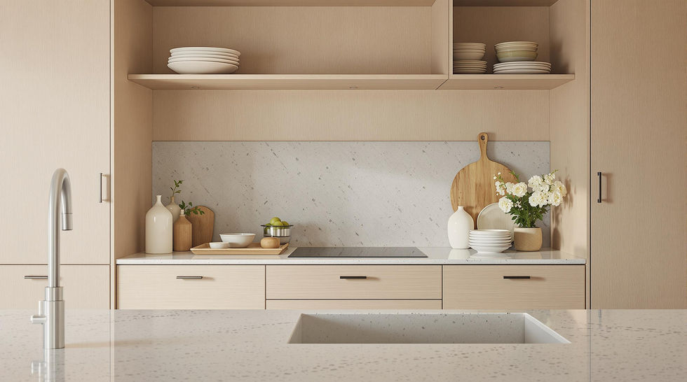 A calm and airy kitchen inspired by coastal living with soft tones, open shelving, and natural materials like light wood and stone. Key features include efficient layout planning and personalized storage customization presented through detailed 3D renderings.