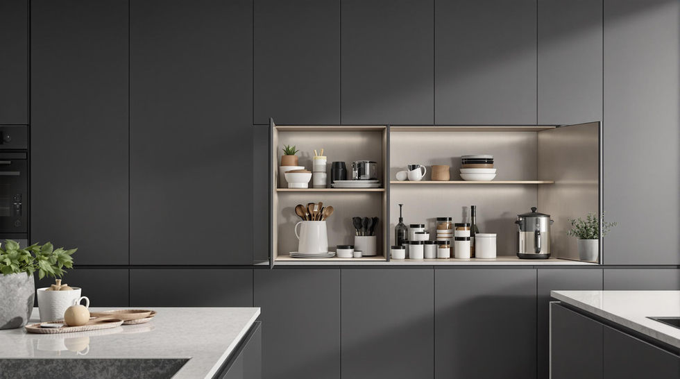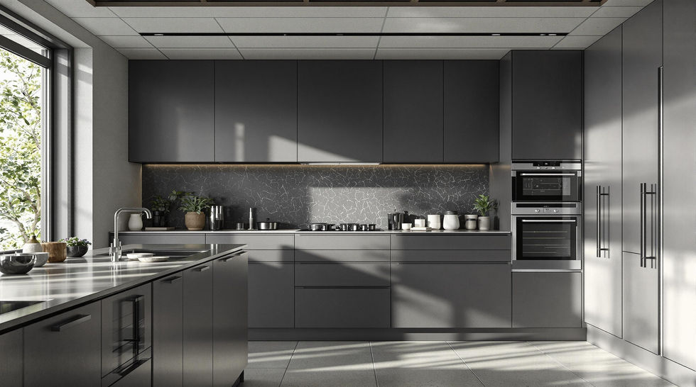 A sleek, minimalist kitchen design combining functionality and sophistication. The project features seamless cabinetry, hidden storage solutions, and integrated smart appliances. The 3D rendering provided clients with clear visualization of the final design in their space.